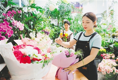 8月27日,呼和浩特市一家花店的工作人员正在打包花束。8月29日是中国传统七夕节,节日来临之际,呼和浩特的大街小巷弥漫着甜蜜的气息,“浪漫经济”逐步升温。本报记者 孟和朝鲁 摄
