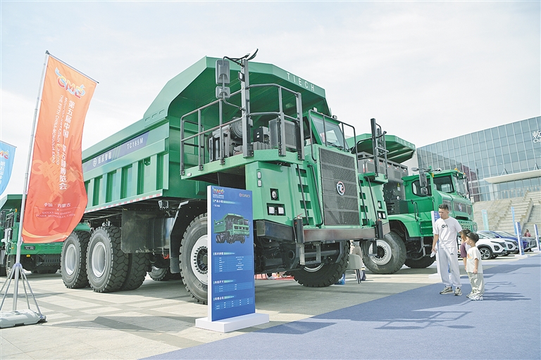 在无人机展示区旁是矿用设备区的“重量级嘉宾”——130吨载重量的EM186H混动版矿用卡车自带气场。据展区负责人介绍,这款“大块头”身怀“轴驱动+首尾转向”的硬核绝技,即便在复杂崎岖的矿山地形中,也能灵活转弯、畅行无阻;更可选配无人驾驶模式,自主完成路线规划、障碍躲避等操作,宛如从科幻大片中走出来的“矿山巨无霸”。与这款矿用卡车遥相呼应的,是同样闪耀的无人驾驶矿山运输机器人。借助先进的智能协同系统,它们能迅速组成一支训练有素的 “矿山快递员”队伍,精准高效地完成物料运输任务。这不仅大幅降低了矿山作业的人力成本,更有效减少了安全事故风险。