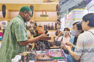 八月二十九日,第五届中蒙博览会现场,加纳参展商向市民游客介绍产品。据了解,本届中蒙博览会邀请了国内外嘉宾和参展客商近六千人,包括蒙古国、俄罗斯、东北亚相关国家以及巴西、乌拉圭、肯尼亚、莫桑比克等南美洲和非洲国家,让本届博览会充满浓浓的“国际范”。本报记者 贾奕村 摄