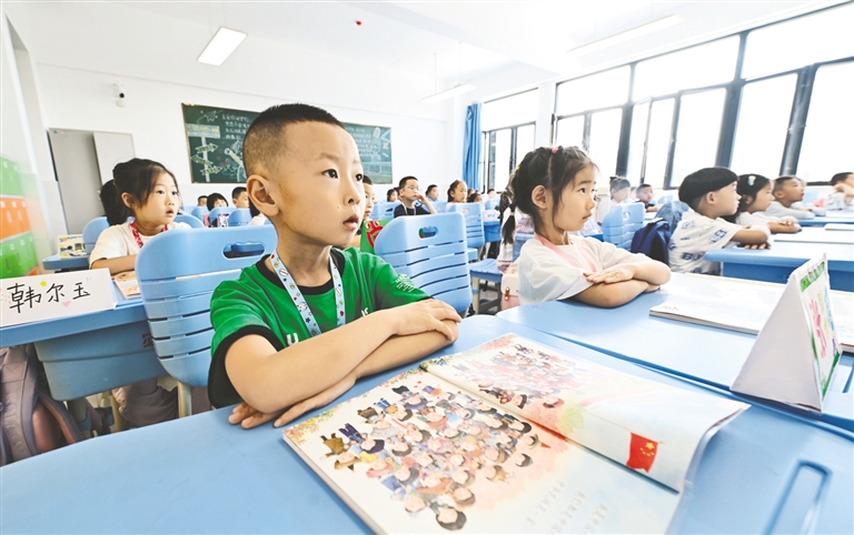 9月1日,呼和浩特市第四十三中学一年级小学生迎来开学第一课。当日,呼和浩特市第四十三中学全体师生齐聚操场,隆重举行2025—2026学年第一学期开学典礼。学校围绕抗战胜利80周年主题,分学段组织开展“开学第一课”教育活动,引导同学们赓续红色血脉,坚定理想信念。 本报记者 王磊 摄