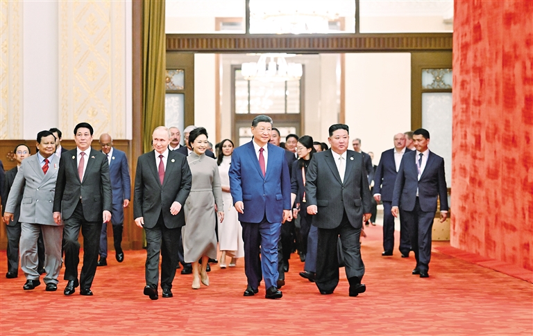 在喜庆欢乐的乐曲声中,习近平同中外嘉宾一起举杯,共同庆祝中国人民抗日战争和世界反法西斯战争的伟大胜利,共同祝愿世界和平。