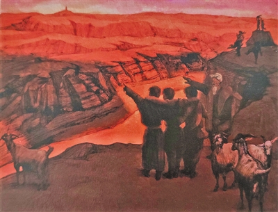 随着大青山抗日游击根据地的建立,中共中央和西北工委多次指示大青山地区党组织,从绥蒙地区选送进步青年到延安学习、培养。根据党中央的指示精神,从1939年到1942年,大青山抗日根据地党组织先后动员、组织了九批共100多名蒙汉青年到延安,进入陕北公学学习,为党的组织和内蒙古地区的民族解放斗争培养后备力量。这一历史事实在内蒙古的美术创作中也得到了充分表达。这一主题的美术创作主要有两类,一类是表现北疆儿女奔赴延安,投身革命的情景;一类是表现毛泽东等老一辈革命家关怀这些少数民族进步青年,亲切会见他们的场景。1978年,妥木斯以满腔热情为内蒙古博物馆创作了油画《奔向延安》和《送别延安》。2013年,在“内蒙古重大历史文化题材美术创作工程”中,张鹏完成了版画《蒙古族青年奔赴延安》。作者采取了一个独特的视角,表现几个蒙古族青年在黄河岸边遥望延安宝塔山的情景,读者的视线顺着画中人物的手势延伸到河的对岸——革命圣地延安。浓重的红色笼罩画面,既是朝霞的颜色,又具有强烈的象征意味,预示着向往延安的蒙古族青年前方的道路格外神圣,也预示着光明的未来。2021年,在“红色百年内蒙古——大型主题油画、雕塑创作工程”中,李长胜完成了油画《来到宝塔山下》,作品表现大青山地区蒙汉青年突破层层封锁线,终于到达延安的情景。画家采用现实主义的创作方法,尽力追求画面的真实性和历史感,人物塑造纯朴自然,细节丰富,色彩厚重,给人以朴实、真切之感。