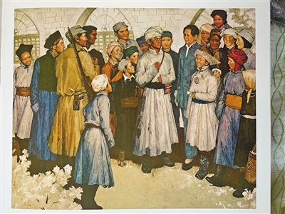 对于来到延安的少数民族进步青年,党中央高度重视,毛泽东等领导人先后接见他们,给这些革命青年以极大的鼓舞。这在内蒙古的美术创作中也得到了充分表达。最早表现这一主题的是女画家金高,1964年金高创作了油画《毛主席在延安接见蒙古族青年》,比较成功地塑造了人民领袖和众多蒙古族青年的群体形象。思沁的中国画《关怀》(1978年)和孟喜元的中国画《心向延安》(2011年)表现的也是这一内容,两件作品都描绘了毛泽东、朱总司令和周恩来在延安窑洞前会见蒙古族革命青年的场景,而且都采用中国画的写意形式,语言朴素,人物塑造真实可信,洋溢着一种积极乐观的情愫。同一主题的中国画作品还有郝存祥1976年创作的《语重心长》和《任重道远》,画家把人物置身于延安的真实环境中,描绘了毛主席与北疆儿女的集体群像。