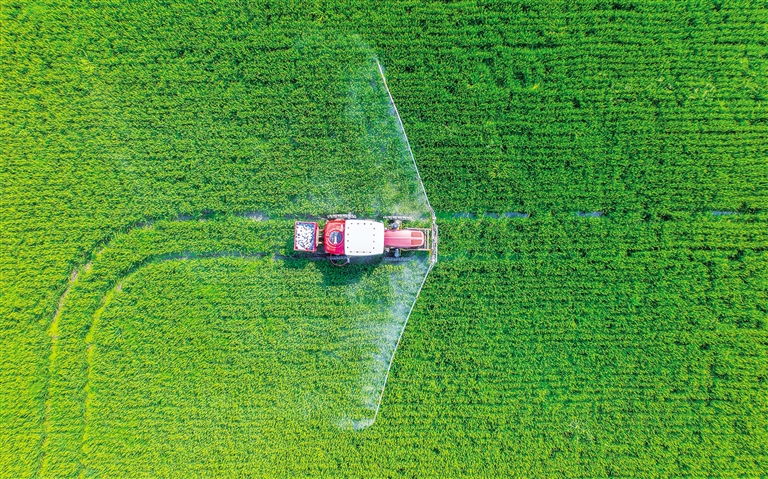 9月6日,在江苏省海安市角斜镇范堑村,村民驾驶植保机械在水稻田里进行喷洒药物作业(无人机照片)。白露节气将至,各地农民抢抓农时,田间地头一片农忙景象。新华社发