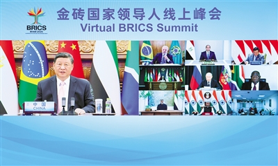 第三,坚持团结合作,凝聚共同发展合力。金砖国家人口占世界近一半,经济总量约占世界30%,贸易总额占世界五分之一。金砖国家合作越紧密,应对外部风险挑战的底气就越足、办法就越多、效果就越好。中方愿同其他金砖国家一道,落实全球发展倡议,推进高质量共建“一带一路”,发挥各自优势,深化务实合作,在经贸、金融、科技等领域打造更多合作成果,让“大金砖合作”基础更牢、动能更足、影响更大,更多更好惠及各国人民。(讲话全文另发)