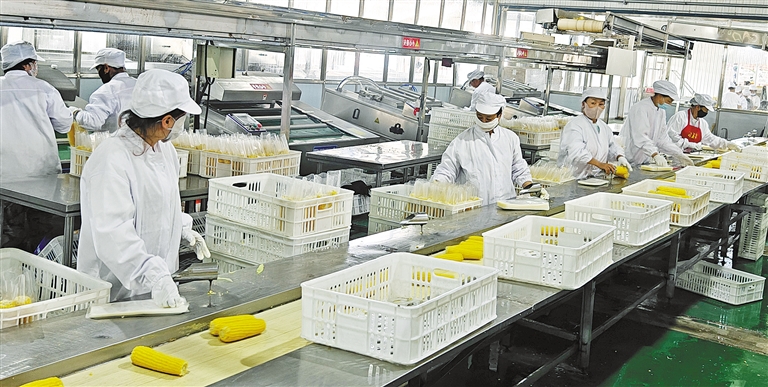 来到加工车间,真空包装生产线正在高效作业。该技术将鲜食玉米的保鲜期延长至12个月,彻底突破季节限制。“目前我们每天可处理鲜玉米14万穗,其中速冻玉米10万穗、真空包装4万穗,全部通过有机认证。”生产负责人谭宝龙介绍:“从采收至成品共设18道工序,严格执行国家食品安全标准。”