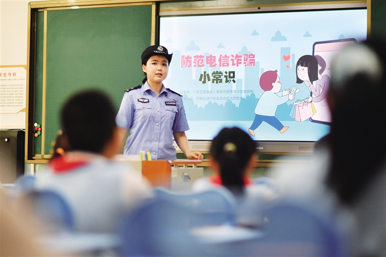 9月15日,在山东省青岛市市北区延安二路小学开展的网络安全教育主题活动上,民警为学生们讲解防范电信诈骗小常识。9月15日至21日,以“网络安全为人民,网络安全靠人民——以高水平安全守护高质量发展”为主题的国家网络安全宣传周在全国范围内开展。 新华社发