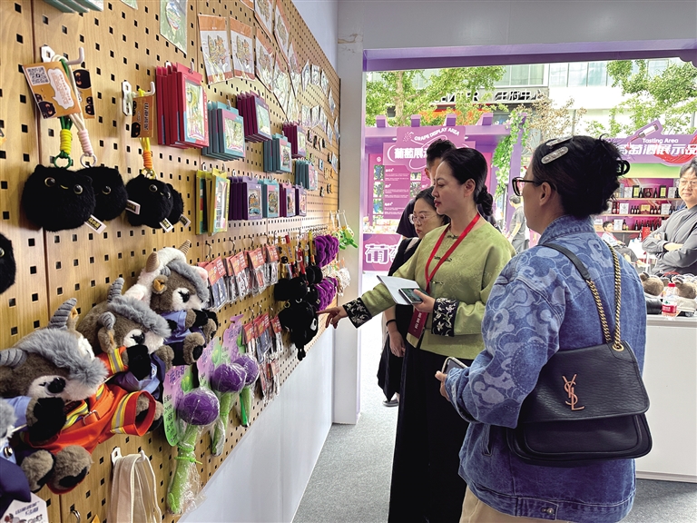 一旁的文创产品展销区同样热度不减,这里集中呈现了融合“乌海葡萄”“中国书法城”等文化元素的周边产品,从城市书签到葡萄毛绒挂件,每一件都承载着乌海的地域特色,成为展示城市文化魅力的重要窗口。据介绍,这些文创产品设计灵感均源自乌海当地的特色文化元素,涵盖了葡萄文化、沙漠文化、黄河文化、煤炭文化等多个方面,形成了别具一格的系列文创产品。