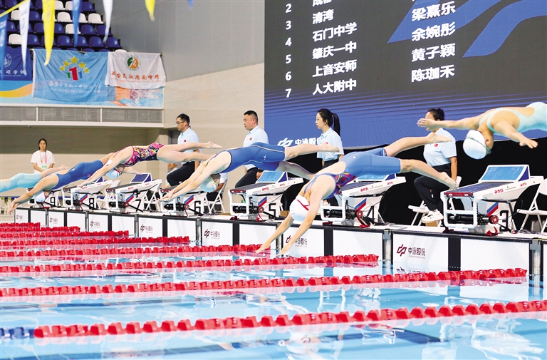9月19日,运动员正在比赛。当日,全国体育传统学校游泳联赛在呼和浩特体育中心举行。本次赛事汇聚全国140所体育传统名校,约1300名青少年泳坛精英,角逐50米至200米个人全泳姿及多项混合接力项目奖牌。本报记者 孟和朝鲁 摄