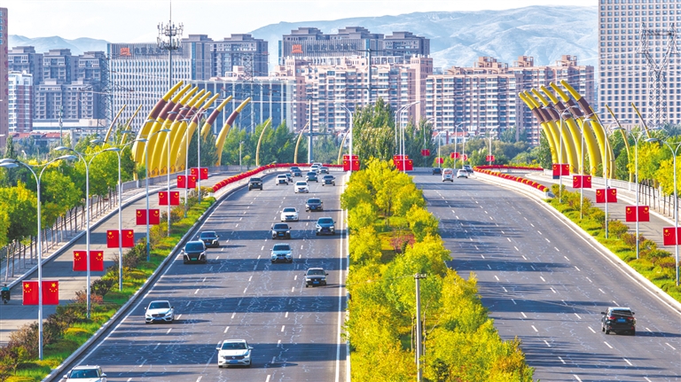 9月30日,数百面国旗悬挂在呼和浩特市丝绸之路大道上。为营造浓厚的国庆节日氛围,呼和浩特市在重点路段、商区及单位规范悬挂国旗,一抹抹鲜艳的“中国红”形成了一道道亮丽的风景线。本报记者 怀特乌勒斯 摄