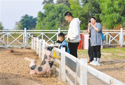 10月4日,家长带小朋友与萌宠互动。国庆中秋“双节”期间,呼和浩特市玉泉区林下郊野萌宠乐园迎来客流高峰,亲子家庭纷至沓来。孩子们围着萌宠雀跃不已,近距离观察它们的习性,亲手投喂美食,在愉悦的互动中享受假期的美好与惬意。本报记者 王磊 摄