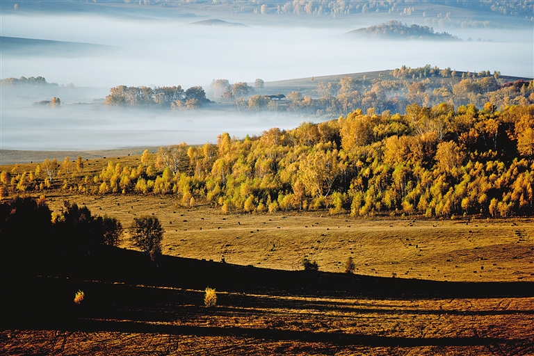 加缪说:“秋天是第二个春天,每一片叶子都是花朵。”枫叶似火,银杏如金,梧桐染黛,松针凝碧,此时此刻,根植于内蒙古草原的株株草叶,绿黄相间,层层叠叠的金翠,经过春夏阳光雨露的滋养,每一棵青草都粗壮有力,在秋风的微拂中翻滚着浪花,芳草连天,成了“花”的海洋。一卷卷已被收割打捆的牧草,齐整整地点缀在大地上,仿若金色的绒毯上镶嵌着一枚枚绿松宝石,空气中洋溢着丰收的喜悦。一年好景,莫过于丰收最抚农人牧人心。呼伦贝尔的金色麦浪,涌动着大丰收的交响;乌兰察布的马铃薯破土而出,一颗颗“土蛋蛋”变成“金豆豆”;乌海的葡萄园里,一串串紫莹莹的葡萄像玛瑙、似珍珠,挂满枝头;鄂尔多斯的阿尔巴斯山羊,身披洁白的厚厚羊绒,咩咩欢叫;巴彦淖尔的向日葵田,棵棵金黄饱满的葵花紧紧拥着太阳,开怀大笑……大地上笑语声声,勤劳质朴的草原人民历经春耕夏种,见证着又一轮的收获,也为金色的时节续写新的传奇。