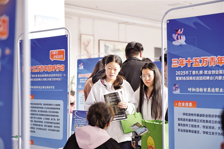 10月12日,求职者在招聘会上向心仪企业认真询问岗位要求。当日,2025年呼和浩特市丁香扎根·就业创业服务进校园系列活动走进内蒙古鸿德文理学院,60家企业提供2068个就业岗位。今年呼和浩特市已举办各类校园专场招聘会16场,入校送岗4.6万个,服务高校学子3万余人。 本报记者 杨林枝 摄