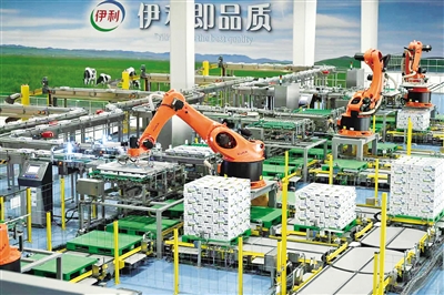 10月12日,呼和浩特伊利现代智慧健康谷液态奶全球智造标杆基地生产车间内,机械手在码放牛奶。近年来,内蒙古先后出台一揽子促进奶产业发展的政策措施,深入推进“从一棵草到一杯奶,再到一块奶酪”奶业全产业链建设,奶牛存栏、牛奶产量已连续7年稳居全国首位,乳制品产量连续3年保持全国第一。本报记者 孟和朝鲁 摄