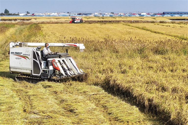 10月15日,在鄂尔多斯市达拉特旗昭君镇沙圪堵村,种植户驾驶收割机抢收水稻。当前,内蒙古的秋收工作进入高峰期,整体进度已超越八成,预计秋收工作将在11月初全部完成。本报记者 王晓博 摄