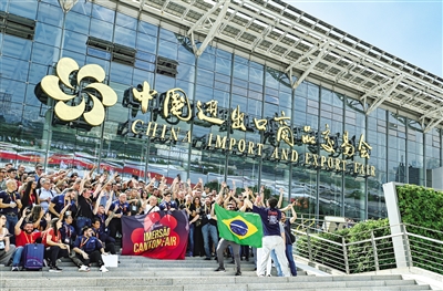 10月15日,客商团体在广交会门口合影留念。10月15日,第138届中国进出口商品交易会(广交会)在广州开幕。据了解,本届广交会展位总数7.46万个,参展企业超3.2万家,均创历史新高。本届广交会已有超24万名采购商预登记,到会头部采购企业预计超400家。