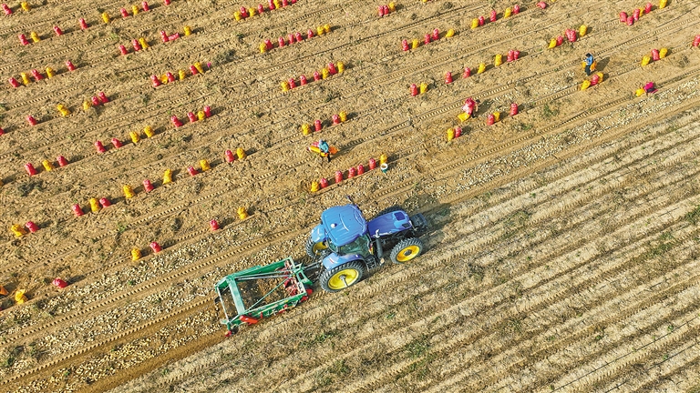 金秋10月,鄂尔多斯市达拉特旗王爱召镇南红桥村的农民采收马铃薯,田间地头一派热火朝天的丰收图景。据农牧部门农情调度显示,截至10月16日,内蒙古大部农区秋收工作接近尾声,未完成收获的地区正抓住晴好天气和降水间歇期,加快完成秋收工作。本报记者 王晓博 摄