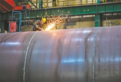 10月21日,在位于包头市的中国二冶集团钢构分公司生产车间,工作人员正在制作风力发电机塔筒。入秋以来,该公司吹响项目生产“冲锋号”,生产线满负荷运转,全力完成风机塔筒订单,保障新能源项目建设进度。本报记者 孟和朝鲁 摄