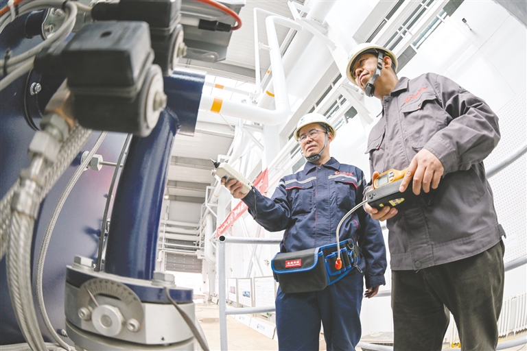 10月23日,在包头昆都仑经济技术开发区中博绿能智慧低碳能源岛项目区,工作人员正在进行设备检测。作为国内首个实现绿氢规模化应用于工业蒸汽供应的示范工程,该项目构建以全自动化天然气掺氢供能系统为核心的综合能源供给体系, 为园区企业提供高品质清洁能源,综合能效利用率高达99%以上,年减碳量超过50万吨。本报记者 孟和朝鲁 摄