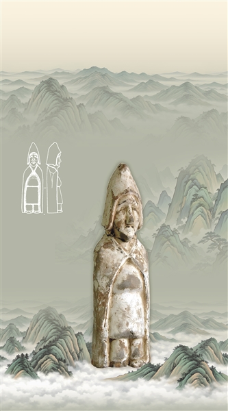 汉代披斗篷伫立的胡俑,身着白衣,戴尖顶风帽,披拖地披风,为鄂尔多斯地区出土最早的胡俑,是研究该地区汉代人群组合的珍贵形象化史料。