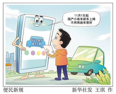 下月起,国产小客车新车上牌不用再跑车管所!国产小客车新车上牌“一件事”服务11月1日起在全国全面推行,全面推进买车、购险、缴税、上牌等“信息联动、一站办结”,群众办事时间将从线下2个多小时压缩至线上半小时内。新华社发 王琪 作