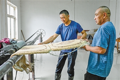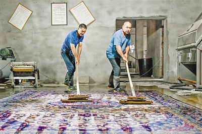 在设计与绘图部,工作人员投入地绘制地毯上的牡丹花图案;在车间内,女工们手法娴熟地操作着织机,日复一日地累织出绚丽图案……阿拉善地毯经过构思设计、织作、平、剪、洗、造旧等工序层层打磨,最终织造出的地毯具有质刚、弹性强、拉力强、光泽好的特点,实用与美感完美融合。