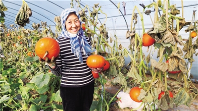 10月30日,在通辽市科尔沁区育新镇黄家窝堡村大棚内,金黄色的贝贝南瓜挂满藤蔓,村民们正忙着采收、分拣、装袋。据了解,通辽市科尔沁区充分发挥主城区优势,大力发展以设施蔬菜、露地蔬菜为主的“菜篮子”工程。今年,该区设施农业总占地面积达1.74万亩,露地蔬菜种植面积约6万亩。 本报记者 鲍庆胜 摄