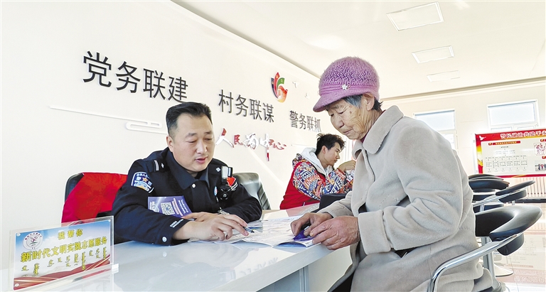 近日,在呼伦贝尔边境管理支队“三务融合”实践站里,民警正耐心为居民讲解反诈宣传册内容。该支队6个“三务融合”实践站覆盖5个边境旗(市),践行“党务联建、村务联谋、警务联抓”,让群众在暖心服务中感受治理温度。李永建 摄