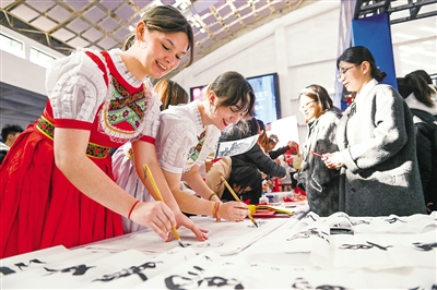 11月1日,来自俄罗斯的留学生在活动中写书法。当日,为弘扬中华优秀传统文化,促进中外文化交流互鉴,内蒙古师范大学第二届国际文化节在赛罕校区开幕,来自14个国家的1000余名中外学子欢聚一堂,乐享文化盛宴。本届国际文化节以“一带一路筑梦,文化交融暖心”为主题,突出互动性与参与性,通过各国民俗文化展示、文艺表演、美食体验等多元形式,搭建起跨文化对话的桥梁。本报记者 王磊 摄