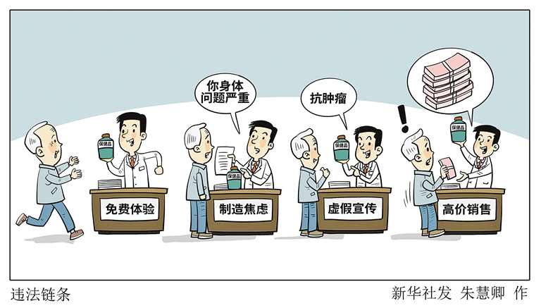 近日,市场监管总局公布7起老年人药品、保健品虚假宣传典型案例。这些典型案例通过“免费体验—制造焦虑—虚假宣传—高价销售”形成违法链条,诱使老年消费者购买高价保健品。新华社发 朱慧卿 作