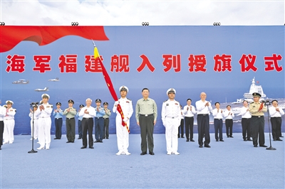 下午4时30分许,入列授旗仪式开始,全场高唱中华人民共和国国歌,五星红旗冉冉升起。仪仗礼兵护卫着八一军旗,正步行进到主席台前。习近平将八一军旗授予福建舰舰长、政治委员。福建舰舰长、政治委员向习近平敬礼,从习近平手中接过八一军旗。习近平同他们合影留念。入列授旗仪式在中国人民解放军军歌声中结束。