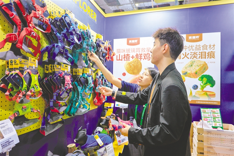 11月8日,在第八届进博会消费品展区,观众(右)在一家宠物用品店选购。第八届中国国际进口博览会消费品展区以“更高品质、更好生活”为主题。展区内服饰、日化、家居、文体等消费品集中亮相,纷呈的新意与匠心,为“更好生活”写下生动注脚,也为全球消费趋势与生活品质升级提供了直观的洞察窗口。新华社记者 刘佳琪 摄