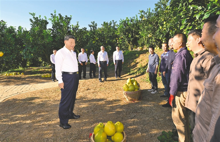 金柚是梅州的特色农产品。正值收获季节,柚子园硕果累累。习近平来到雁洋镇南福金柚种植基地,在展示厅听取广东加大对革命老区支持力度、推进乡村全面振兴等情况汇报,察看柚子及其加工产品、文创产品。他走进果林,同果农和农技人员亲切交流。得知今年金柚喜获丰收、销路畅通,习近平十分高兴。他指出,发展乡村特色产业是推进乡村全面振兴的基础,要加强科技应用,推动农文旅融合,不断延伸产业链、增加附加值,带动更多农民群众增收致富。
