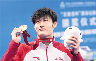 11月13日,冠军山东队选手徐放在颁奖仪式中展示金牌。当日,第十五届全国运动会游泳男子200米蝶泳决赛在广东省深圳市举行。