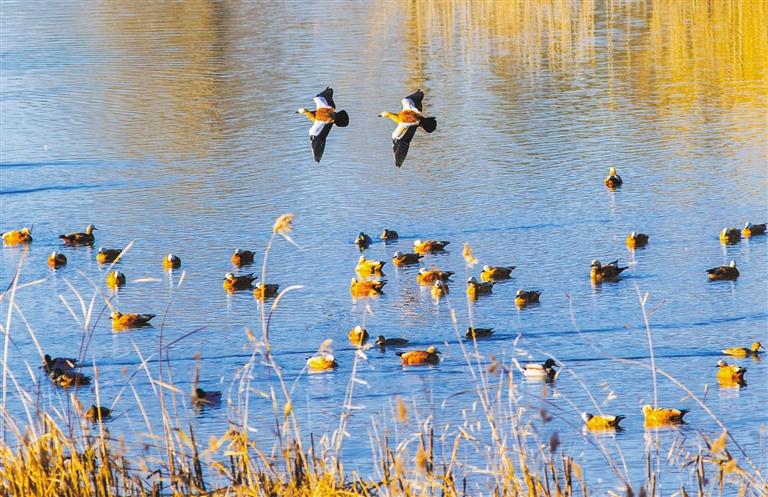 初冬时节,呼和浩特市大黑河郊野公园生机涌动,成为候鸟的“服务区”与“能量补给站”。近年来,通过河道综合治理、湿地系统性保护与修复等举措,大黑河水质持续优化、沿岸植被愈发繁茂。充足的食物、安全的栖息环境,让这里变成了候鸟迁徙途中的“理想家园”。图为赤麻鸭在水面栖息。本报记者 王磊 摄