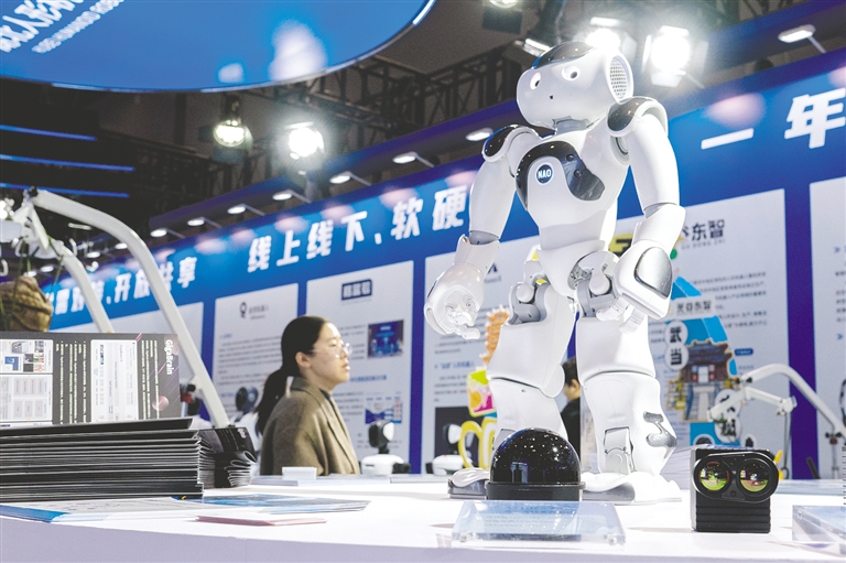11月21日,参观者在2025中国5G+工业互联网大会展厅参观人形机器人。11月21日至23日,以“万物互联 智能领航”为主题的2025中国5G+工业互联网大会在湖北武汉举办。  新华社记者  杜子璇  摄