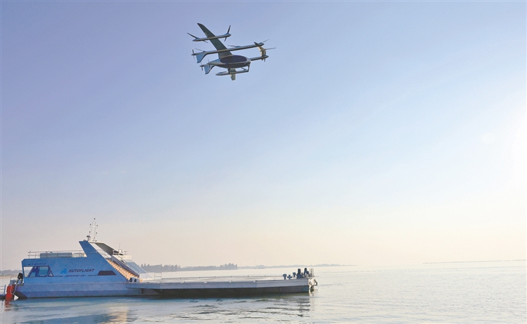 11月22日,一架电动垂直起降飞行器从零碳水上机场起飞。11月22日,峰飞航空自主研发的eVTOL零碳水上机场,在江苏昆山的峰飞航空全球科技日活动中正式亮相,由“零碳水上机场”与“eVTOL航空器”协同组成的“海空一体”低空经济解决方案正式发布。通过搭载峰飞航空旗下多款电动垂直起降飞行器(简称eVTOL),“海空一体”低空经济解决方案可满足海洋能源平台运维、高频通勤、海空文旅体验、应急救援以及移动空港集群作业等应用场景需求。 新华社记者 方喆 摄