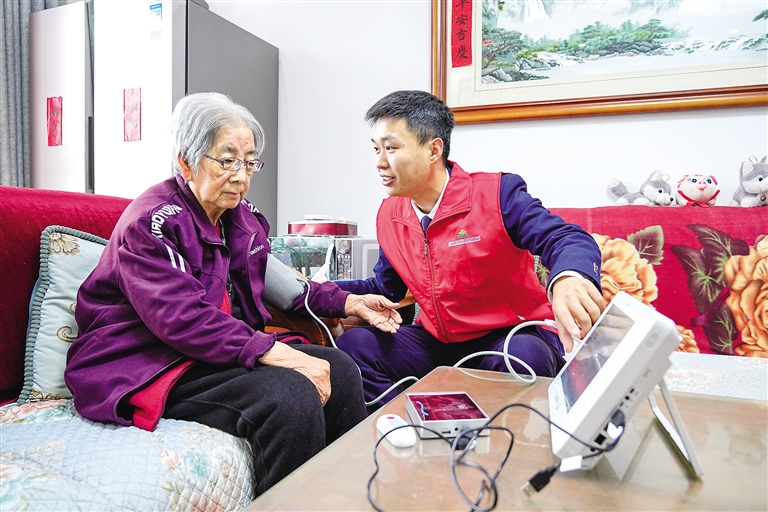 86岁的浙江绍兴柯桥区老人沈来水,不久前用上了社区配备的智能监护套装,居家就能享受24小时健康监测、远程问诊和紧急救助服务。