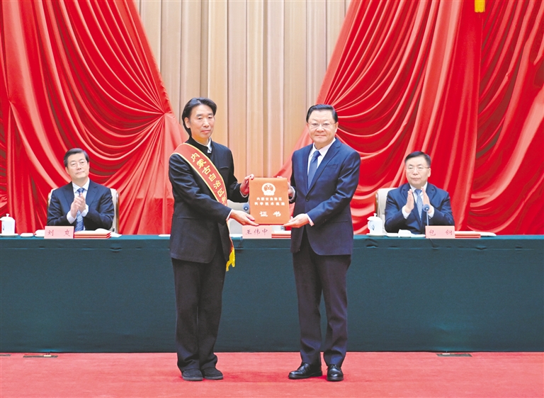十一月二十七日,自治区党委书记王伟中为科学技术进步特等奖第一完成人张鹏举颁奖。 本报记者 马建兵 摄