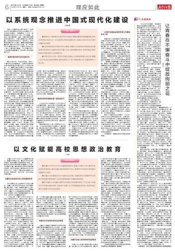 ●以系统观念推进中国式现代化建设,就要以大历史观和实践辩证法正确处理中国式现代化进程中的若干重大关系,运用前瞻性思考、全局性谋划、整体性推进中国式现代化的思想方法