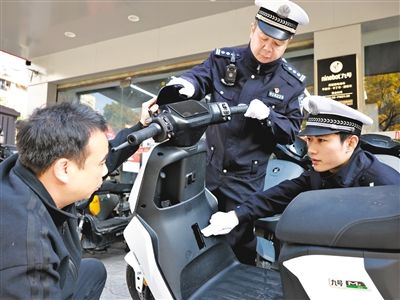 12月1日,在湖北省武汉市武昌区九号电动车平安路店,武昌区交通管理大队民警给销售人员宣讲“旧国标”电动自行车停售政策。根据新版强制性国家标准《电动自行车安全技术规范》,12月1日之后,所有销售的电动自行车产品均必须符合新标准规定。新标准强化安全管理的同时,能更好满足消费者日常使用需求。 新华社发