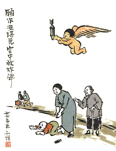 丰子恺早年憧憬的生活是:天下如一家,人们如家人,互相亲爱,互相帮助,共乐其生活。然而,日寇入侵,“蛮夷猾夏”,他的美好憧憬被战火所破灭。原本满怀护生戒杀慈悲之心的他义愤地呐喊:“只要不转乎沟壑,还可凭五寸不烂之笔对抗暴敌。”(《还我缘缘堂》)“古语云:‘众志成城’。我们四百兆人团结所成的城,是任何种炮火所不得攻破的!”(《爱护同胞》)自此,他便以笔为枪,开始了一个爱国艺术家的抗战作为。
