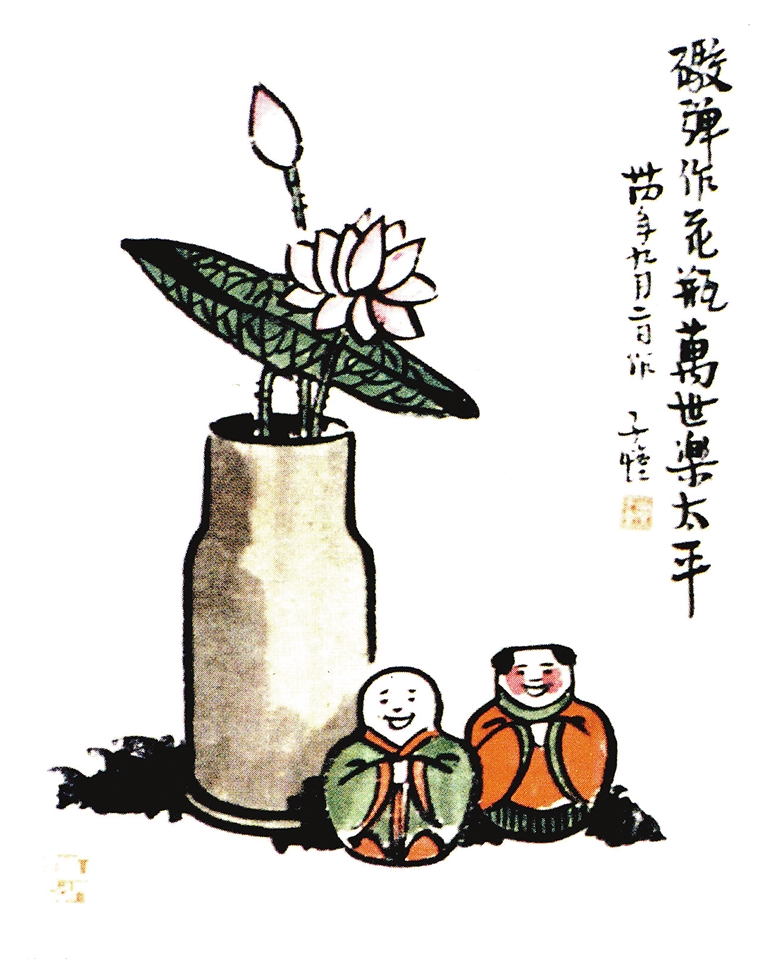 丰子恺讲,有一次,他去访问一位医生朋友,看见朋友书房的案上摆着一瓶莲花。花瓶的样子很别致,仔细一看,原来是个一尺多长的炮弹壳,他大为吃惊,同时“又如获至宝”。“因为这别致的形象也含有丰富深刻的意义,也是我作画的模特儿。用慷慨激昂的演说来拥护和平,远不如默默地画出这瓶莲花来得动人。”于是便有了《炮弹作花瓶,万世乐太平》这幅取材别致、立意不凡的佳作。一向谦逊的丰子恺自己称之为“我又有了一幅得意之作”。这幅《炮弹作花瓶》也是作于1938年,形象地表达了中国人民对和平的期盼之情。