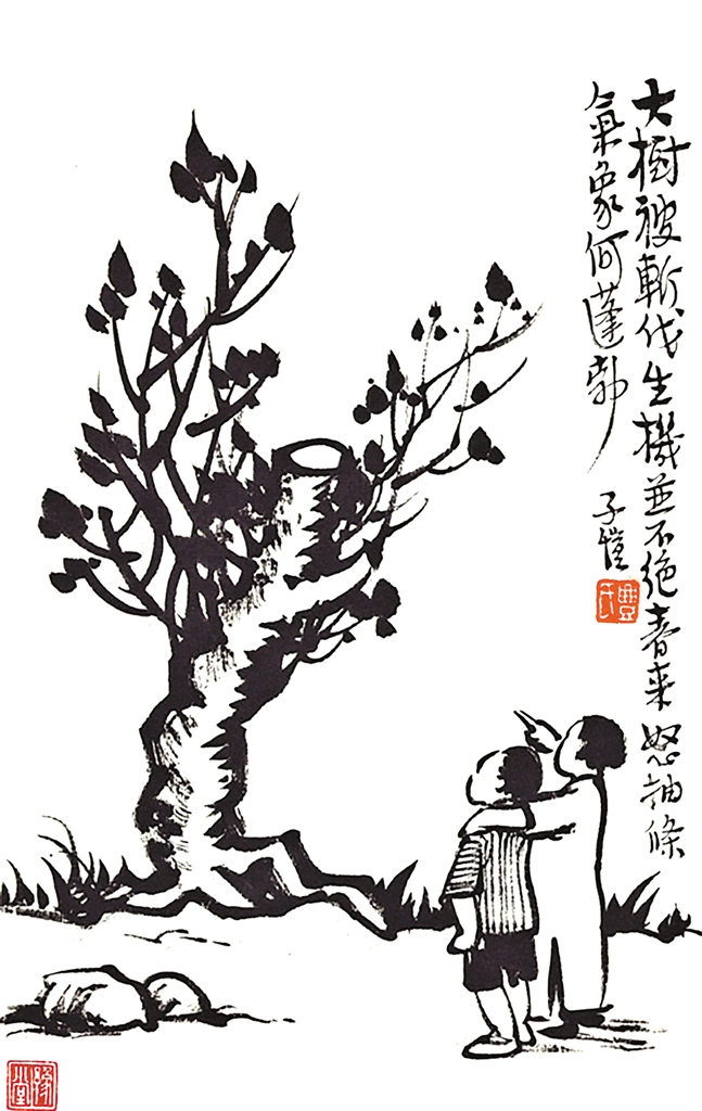 《大树画册》中的第一幅作品,画的是一棵大树遭遇砍伐,但它仍然在根植大地的那段树桩四周长出许多新枝,昭示其不屈的生命力。画幅右上侧题诗道:“大树被斩伐,生机并不绝;春来怒抽条,气象何蓬勃!”以大树而写心志,具有鲜明的象征意义。