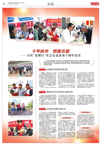 全区“光明行”社会公益活动自2015年启动以来,累计筛查眼疾患者153万人次,为低收入困难家庭白内障患者实施41745例免费复明手术,对302万名青少年进行视力筛查,并建立视力档案,为困难家庭近视儿童免费配镜5310副、实施斜视矫正手术602例,取得了“复明一人、幸福一家、感动一方”的显著社会效益,营造了人道为本、仁爱为怀、高尚利他、善者同行的良好风尚,在区内外凝聚起广泛社会共识与正向能量,交出了一份厚重提气的民生答卷。