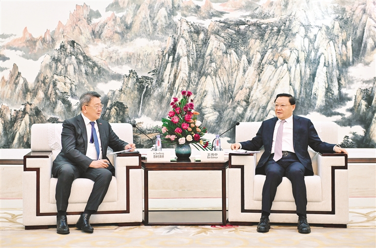 王伟中代表自治区党委和政府对恩赫包勒德一行表示热烈欢迎,对蒙古国驻华使领馆为推动内蒙古自治区与蒙古国的全方位合作作出的积极努力表示衷心感谢,并回顾了内蒙古自治区与蒙古国友好交往交流情况,宣介了中共二十届四中全会精神和内蒙古自治区发展现状。他说,近年来,中蒙两国元首达成的重要共识为双方的合作指明了方向。内蒙古自治区与蒙古国地理相邻,在发展中蒙两国友好合作关系方面具有独特地位和作用,并且与蒙古国在很多领域具有互补优势,合作潜力巨大,前景广阔。我们希望在建设国家向北开放重要桥头堡的进程中进一步加强与蒙古国的合作,愿同蒙古国有关方面一道,认真落实两国元首达成的重要共识,进一步完善合作机制,加强铁路、公路、电网、口岸等互联互通建设,深化社会人文领域交往交流,持续加强能源资源和生态环保领域的务实合作,推动实现更宽领域、更深层次、更高水平的互利共赢,为深化中蒙全面战略伙伴关系、共建两国命运共同体作出贡献。