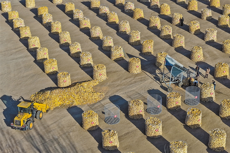 “过去,玉米采收需历经人工采收、铺地晾晒、二次脱粒等多道繁琐工序,不仅效率低下,粮食损耗率还高,严重影响了粮食产量和群众收益。”兴安农垦吐列毛杜农场规模化管理区一区主任安文鹏介绍,籽粒直收技术实现了田间直接脱粒,玉米即时送入烘干塔和标准化仓库,有效破解了“地趴粮”难题。