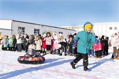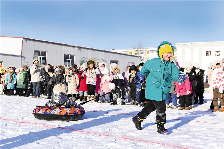 12月24日,呼伦贝尔市额尔古纳市第三小学校园内,孩子们正在拉雪圈、踢雪地足球。12月24日至28日,呼伦贝尔市域义务教育阶段1至8年级学生享受5天“雪假”,当地推出了一系列特色冰雪活动,为中小学生打造兼具趣味性与知识性的假期体验。本报记者 王晓博 摄