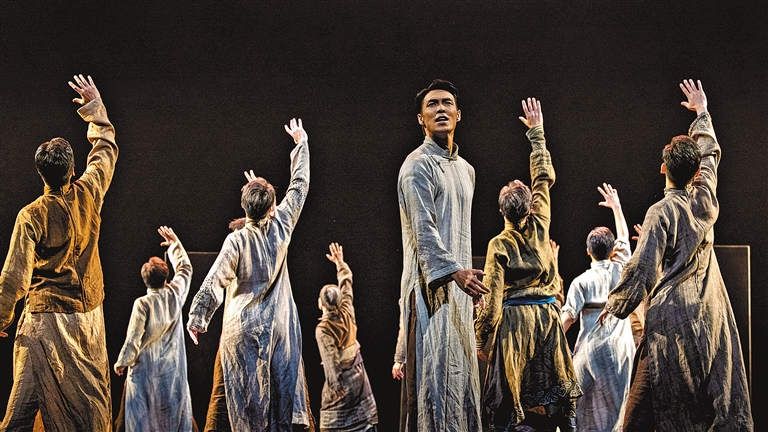 作品中段,多松年牺牲后的场景尤为典型,领舞赵磊在前方小幅度摆动肩膀,身后群舞逐渐以相同动作显现,在倒下的同时被身边的伙伴扶起,这一编排不仅隐喻革命事业前赴后继的精神,也通过肢体语言实现了历史与当代的对话。