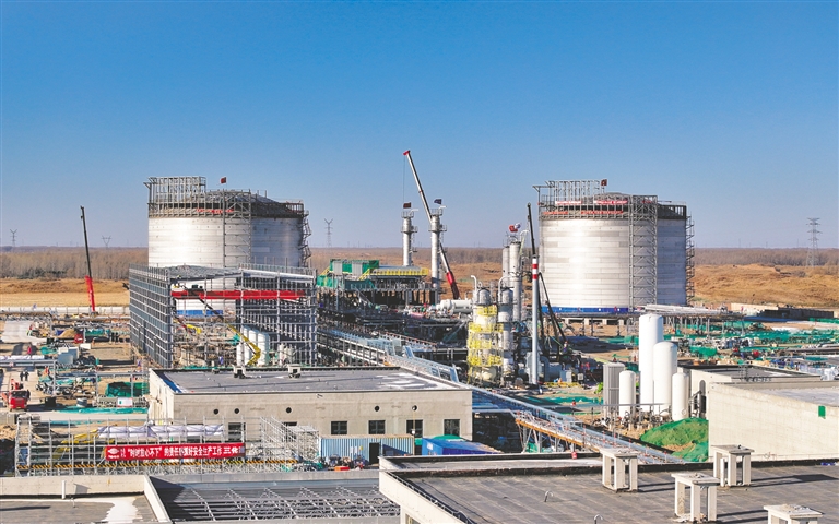 1月4日,在巨融(通辽)能源有限公司120万吨/年液化天然气及配套设施项目现场,大型机械正在吊装设备。截至目前,该项目已完成土建进度90%,安装进度70%。新年伊始,科左后旗工业园区内35个重点项目正在火热建设中,为2026年当地高质量发展注入强劲动能。本报记者 孟和朝鲁 摄